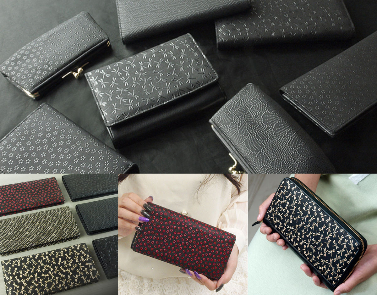 驚くほど柔らかな鹿革に、ぷっくりとした小紋を漆であしらった「鹿乃香印伝」。江戸時代の庶民の巾着袋や財布などに用いられたその技法は、丈夫さと華やかさゆえに戦国武将の武具より広まったと言われます。小紋の代表格「蜻蛉柄」は、当時から縁起の良い装飾として人気がありました。